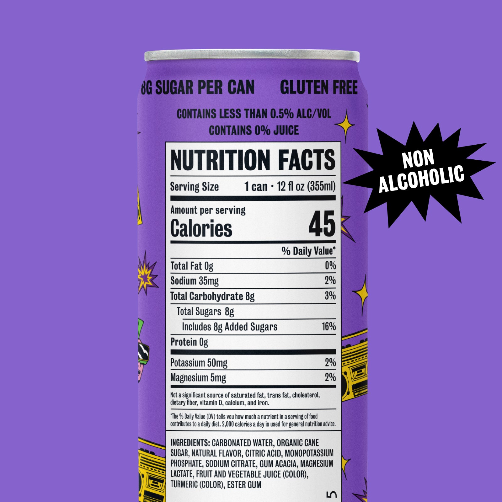 Carbonated Water, Organic Cane Sugar, Natural Flavor, Citric Acid, Monopotassium Phosphate, Sodium Citrate, Gum Acacia, Magnesium Lactate, Fruit and Vegetable Juice (Color), Turmeric (Color), Ester Gum